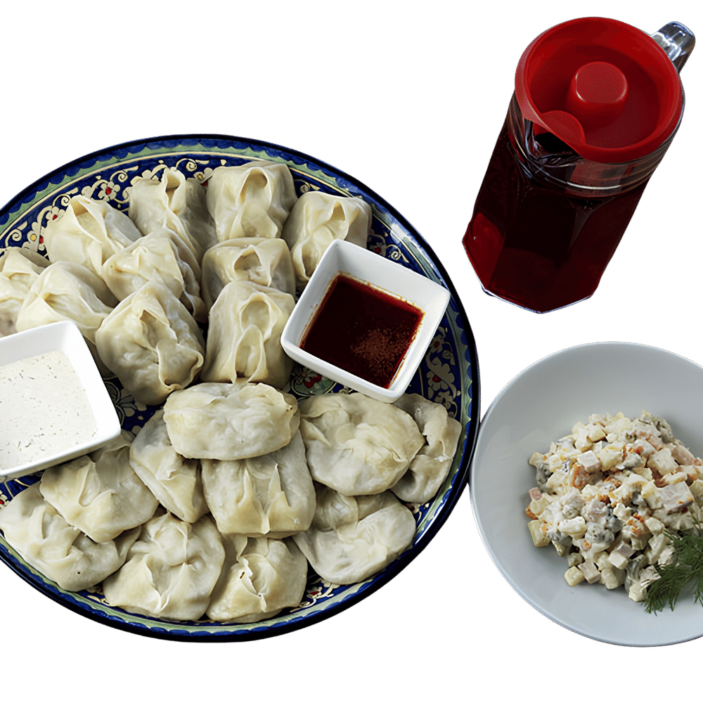 Порция рассчитана на 3-4 человека Состав: Манты с говяжьим фаршем и картофелем -10шт ,манты с говяжьим фаршем -10 , салат оливье-0,3кг ,соус лаза-2 ,соус чесночный-2 , компот или каркаде 1,5л на выбор