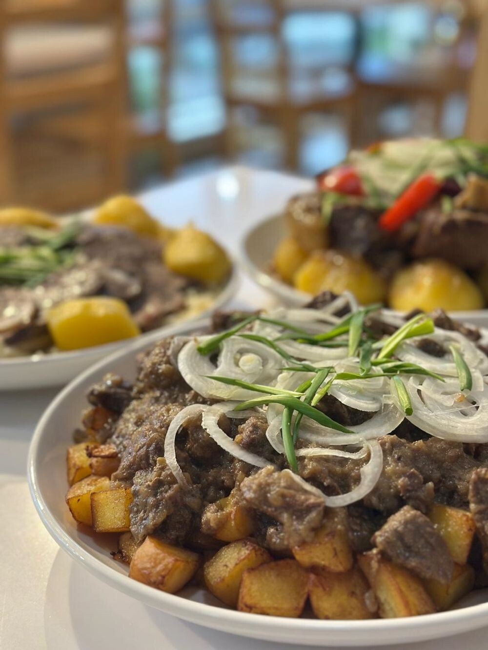 Конина жая , с обжареным картофелем , подается в алюминиевом казанчике. Готовится по предзаказу за 4 часа